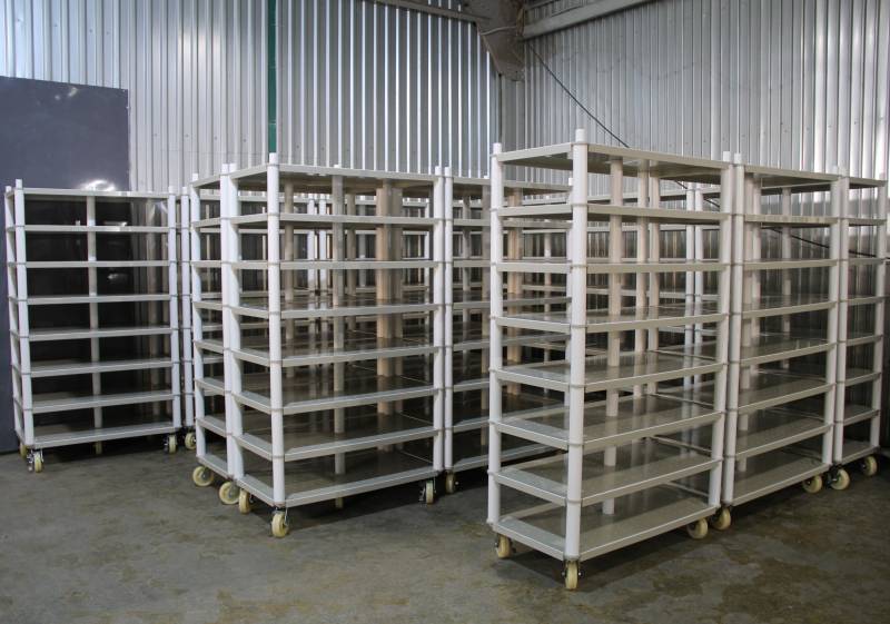 Стеллаж из полипропилена на колёсах, предназначен для хранения продуктов питания, не впитывает и не выделяет запахи, не меняет физико-химические и органолептические свойства продуктов и веществ.